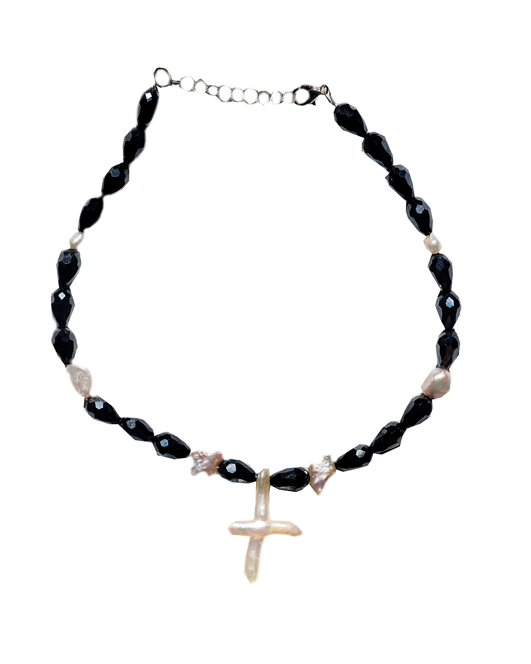 Gun metal crystal glass beads, cream freshwater pearls, freshwater pearl cross