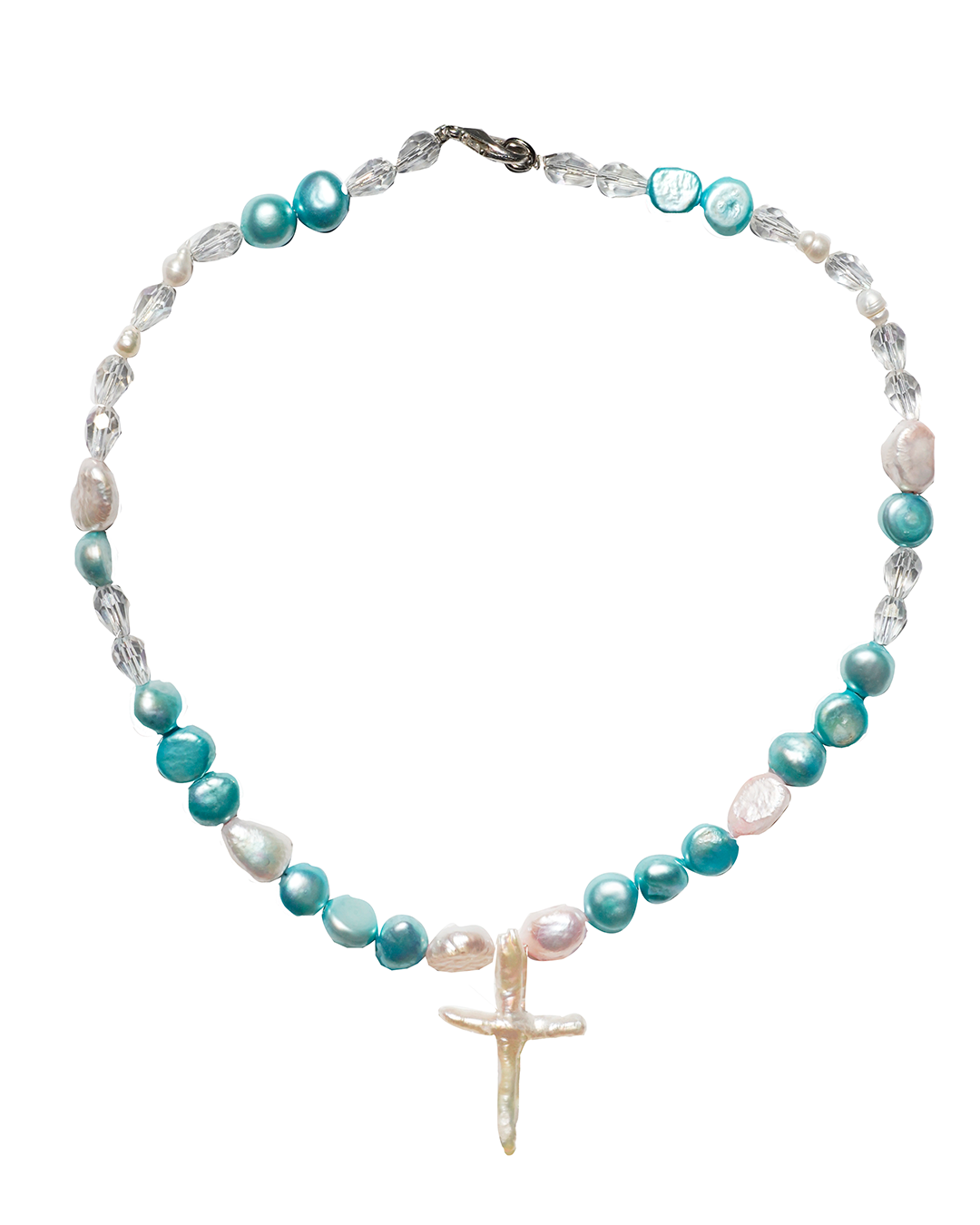 Aquamarine blue & cream freshwater pearls, clear crystal glass beads, freshwater pearl cross