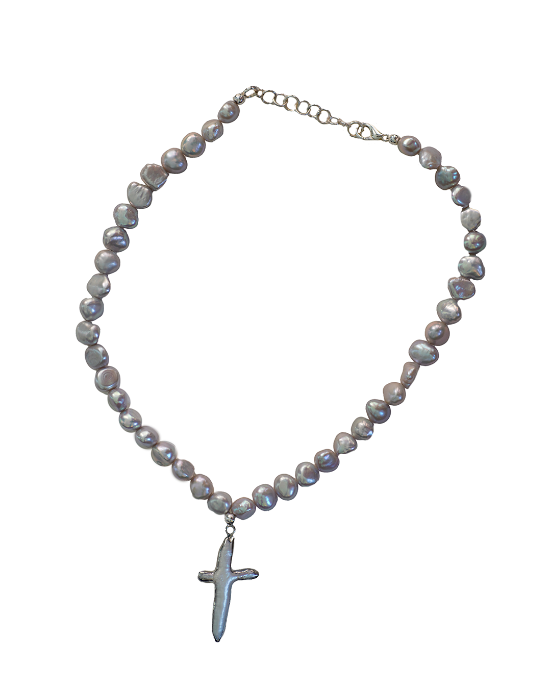 Silvery shimmer grey freshwater pearls surround a baroque pearl cross framed in silver